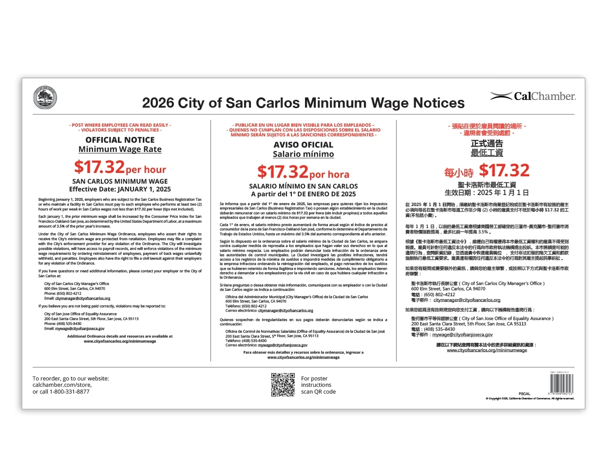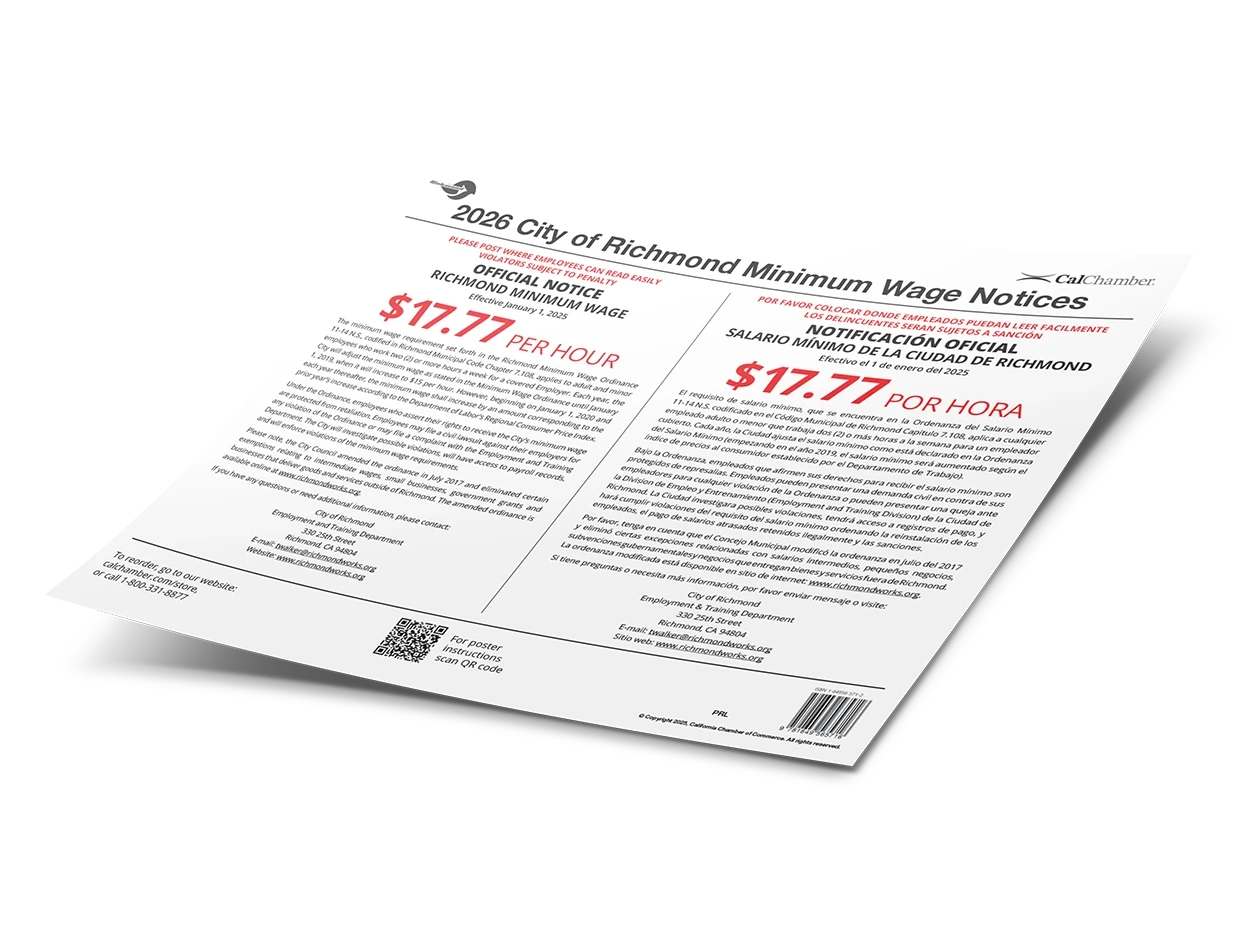 If you need 20 or more posters to meet your California/Federal posting requirement for each business location and jobsite, consider the value of CalChamber filling in (preprinting) your logo plus emergency, payday and other required information for employees that’s specific to your company. Let us do the work so you don’t have to.